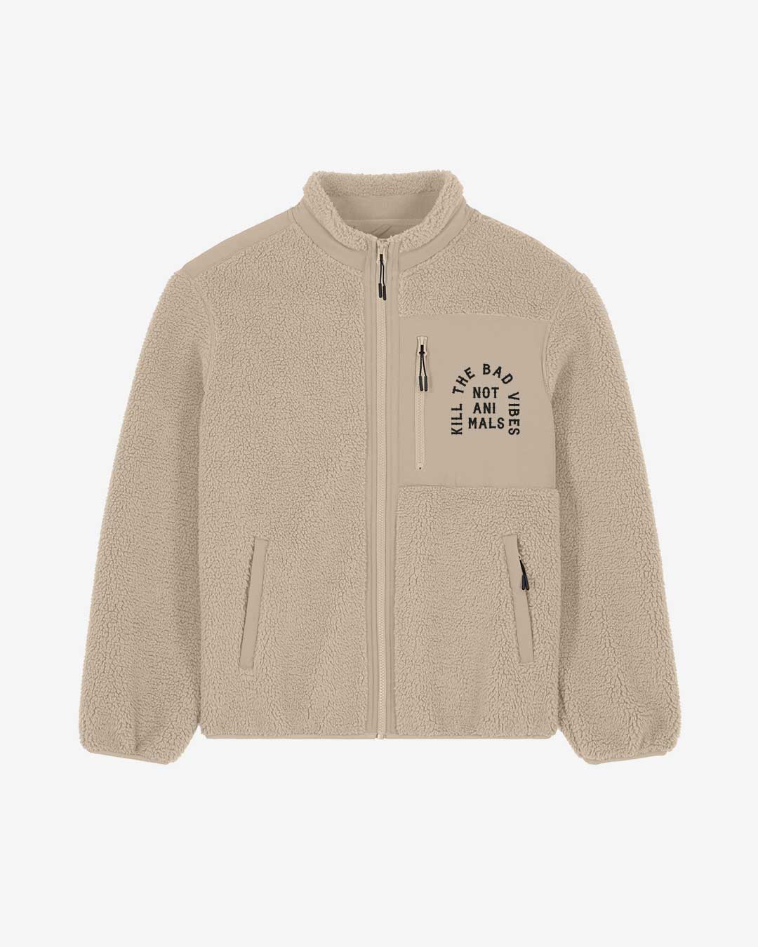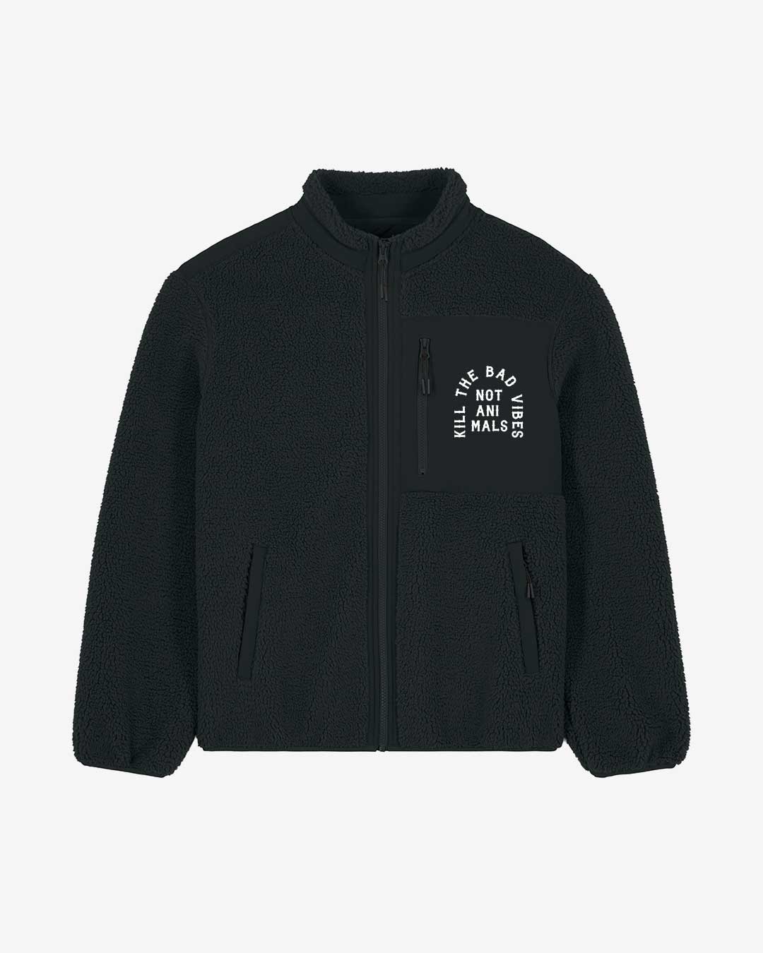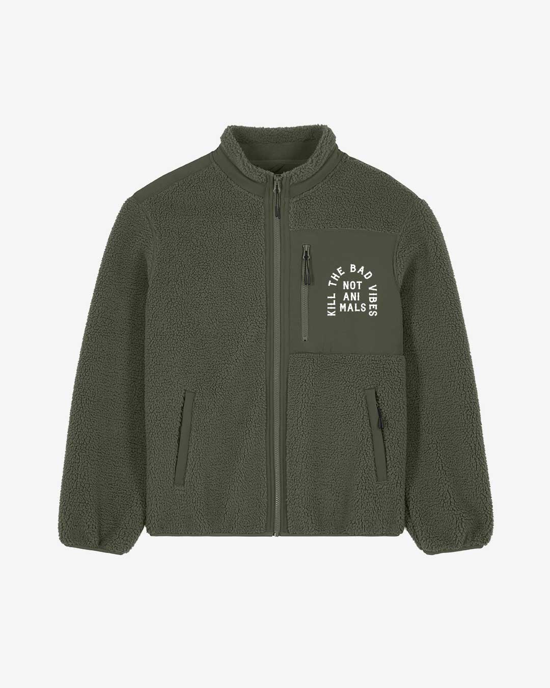 Diese Kill The Bad Vibes Not Animals Sherpa Jacke von ANTI EAT MEAT CLUB kommt mit einem Kill The Bad Vibes Not Animals Design auf der Brusttasche und ist ein toller Begleiter für kältere Tage. Das hochwertige Fleece sorgt dabei für ein maximales Plus an Komfort und fühlt sich angenehm kuschelig auf der Haut an. Die funktionalen Seitentaschen sowie die Brusttasche bieten mit robusten Reisverschlüssen ein sicheres Versteck für all deine wichtigen Dinge im Alltag. Style die Jacke nach Lust und Laune und du bist bereit, die Kälte mit Statement und Stil zu bewältigen.
