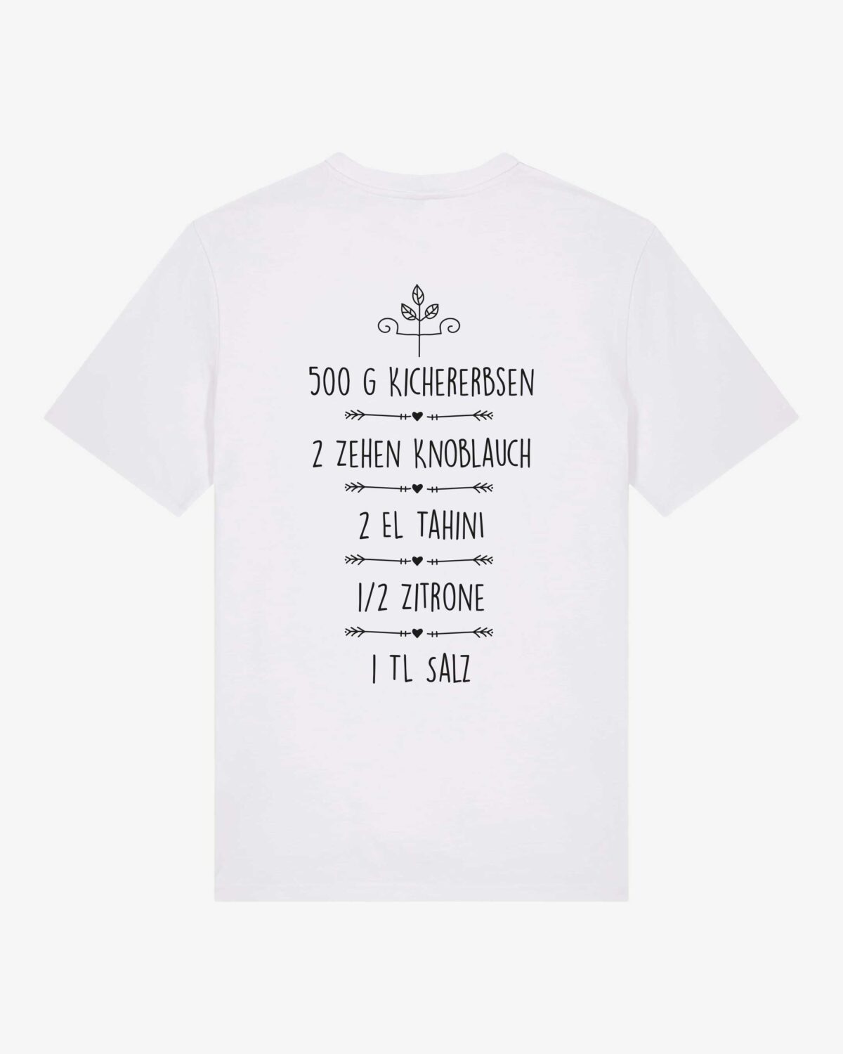 Dieses Spread Hummus Not Hate T-Shirt von ANTI EAT MEAT CLUB kommt mit einem Statement auf der Vorderseite und dem passenden Hummus Rezept auf der Rückseite. Lässiger Style durch klassischen Schnitt. Die Bio-Baumwolle sorgt außerdem für ein ultraweiches und angenehmes Tragegefühl.