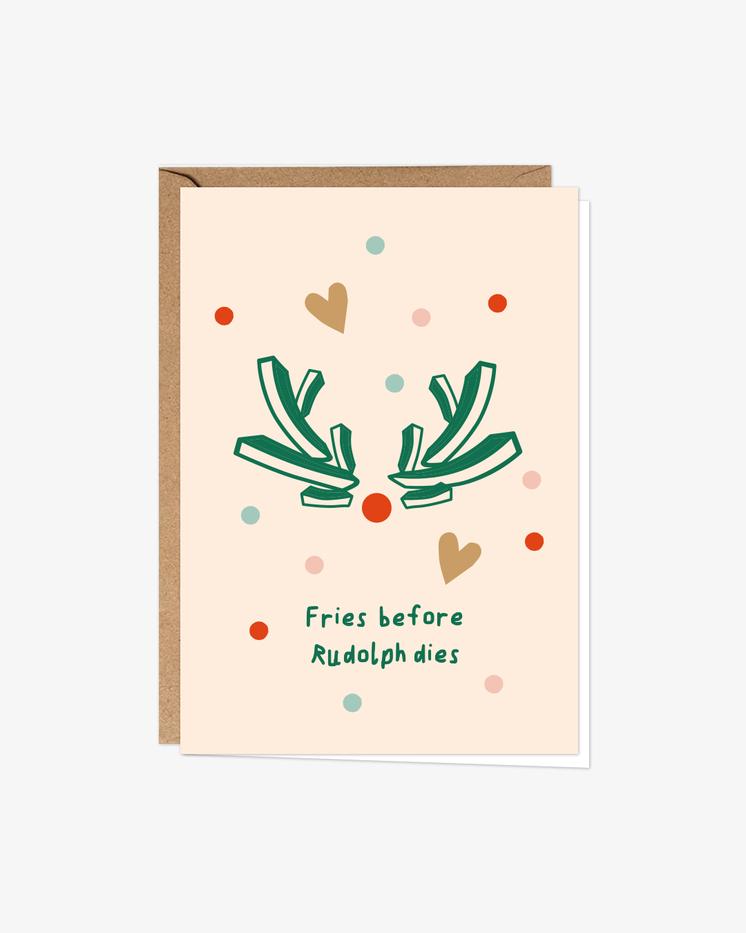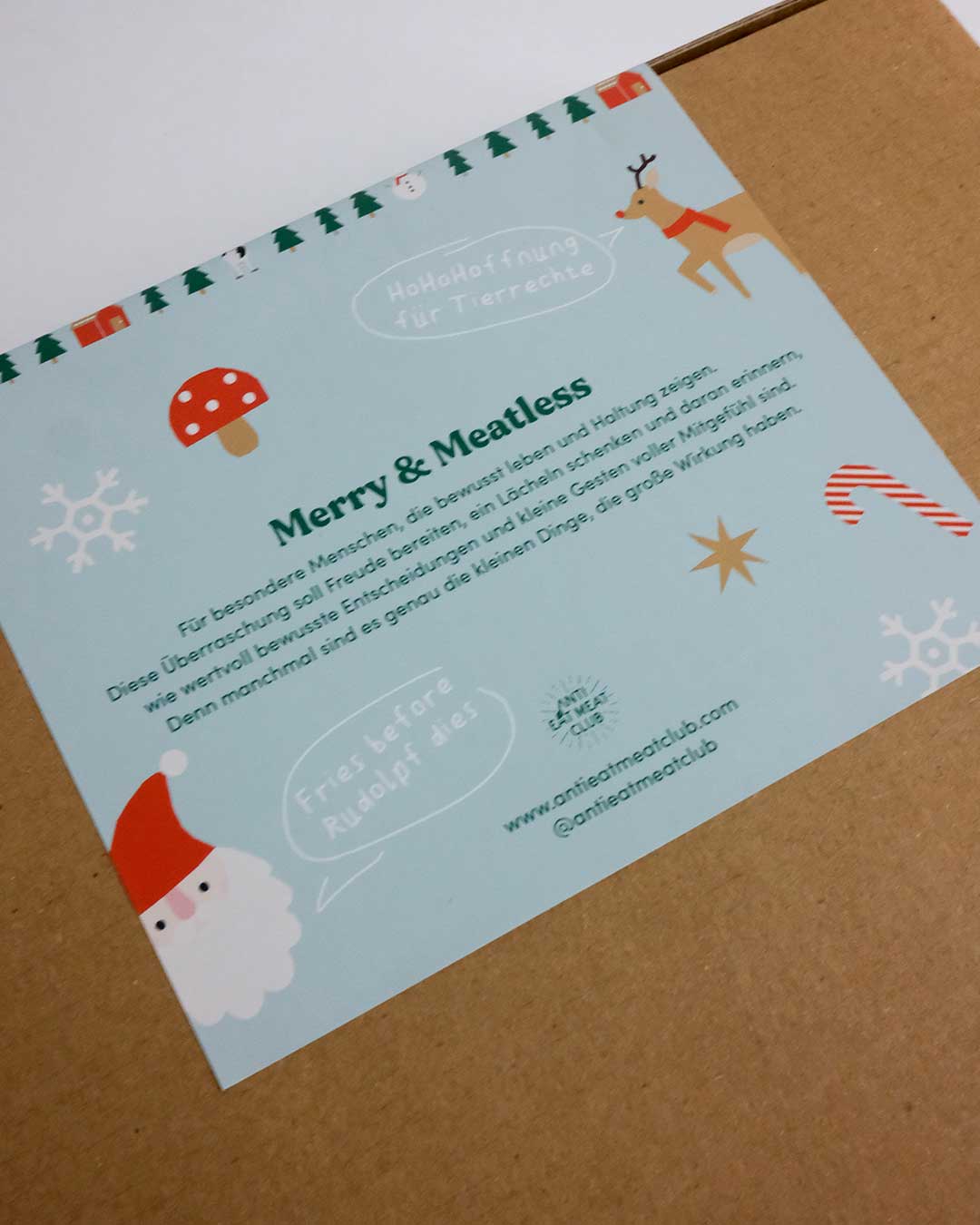 - Weihnachtskarte inkl. Umschlag „Fries Before Rudolph Dies“ (liegt außerhalb der Box)